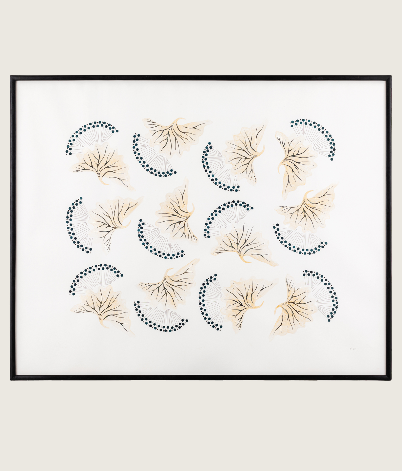 A hybrid of ghostly rhubarb gunera and gingko leaves crowned with beaded spokes float across the paper. The golden acrylic ink washes out to a nearly transparent contour - these golden medusae are staked down by beaded spokes which act as pins holding them down like butterfly specimens in a glass box.