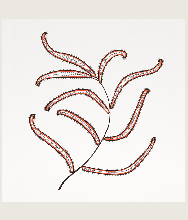 A Jack and the Beanstalk-like plant with leaves that look like caterpillars. Inspired by a friend's old Indian crewelwork cushion.
