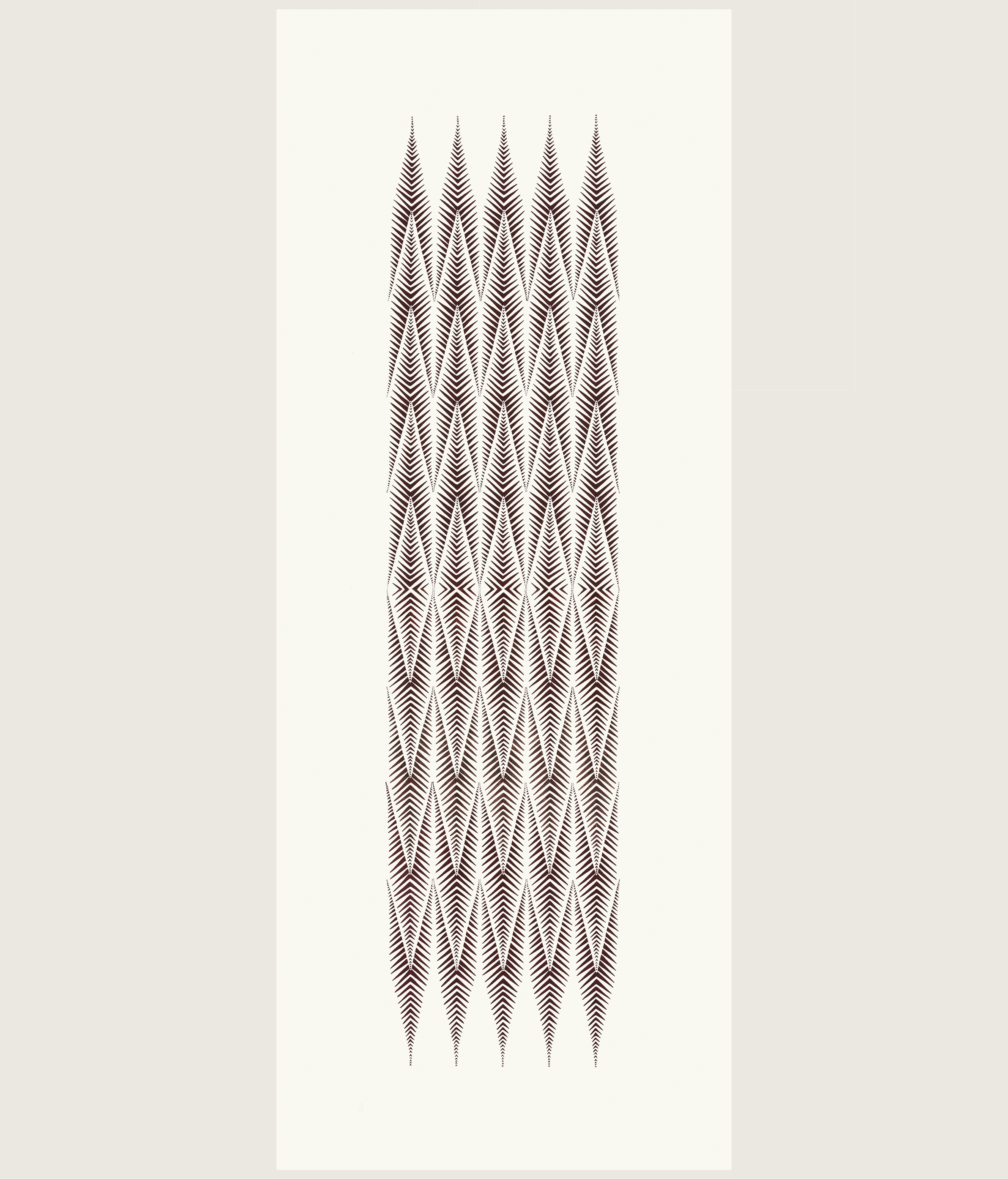 Deep plum triangular spokes grow out of themselves - at the centre it flips over, mirroring the repeat, leaving a border like the ends of a Kashmir Shawl.